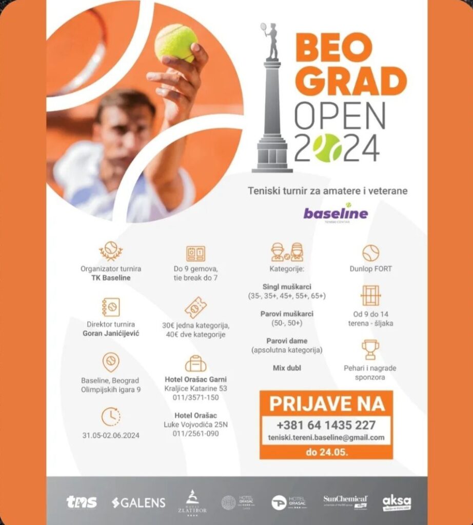 Očekujemo vas na našem terenu od 31. maja do 2. juna 2024. godine na velikom rekreativnom turniru Beograd Open 2024! Prilika je ovo da pokažete svoje tenisko umece i uživate u takmičarskom duhu. Pridružite nam se i budite deo teniskog uzbuđenja koje će obeležiti ovo takmičenje
